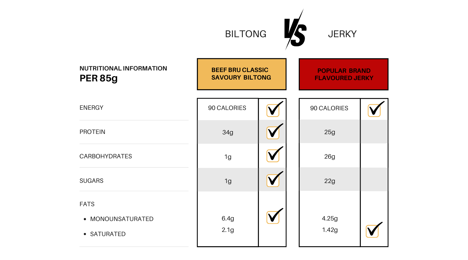 Nutrition duel: Biltong struts in with little to no sugar, low carbs, and half the sodium of most jerky’s. Mic drop. Plus, it’s got more protein and those healthy fats. Keto or carnivore crew, take note!